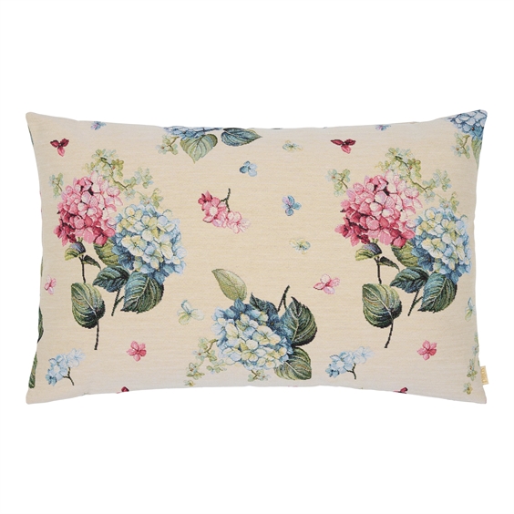 Dette elegante gobelinpudebetræk kombinerer klassisk vævehåndværk med et harmonisk farvespil. Motivet viser blå og lyserøde hortensiaer på en sart beige baggrund, der fremhæver blomsternes naturlige skønhed. Pudebetrækket tilfører romantik og naturinspireret elegance til sofaen, lænestolen eller soveværelset.