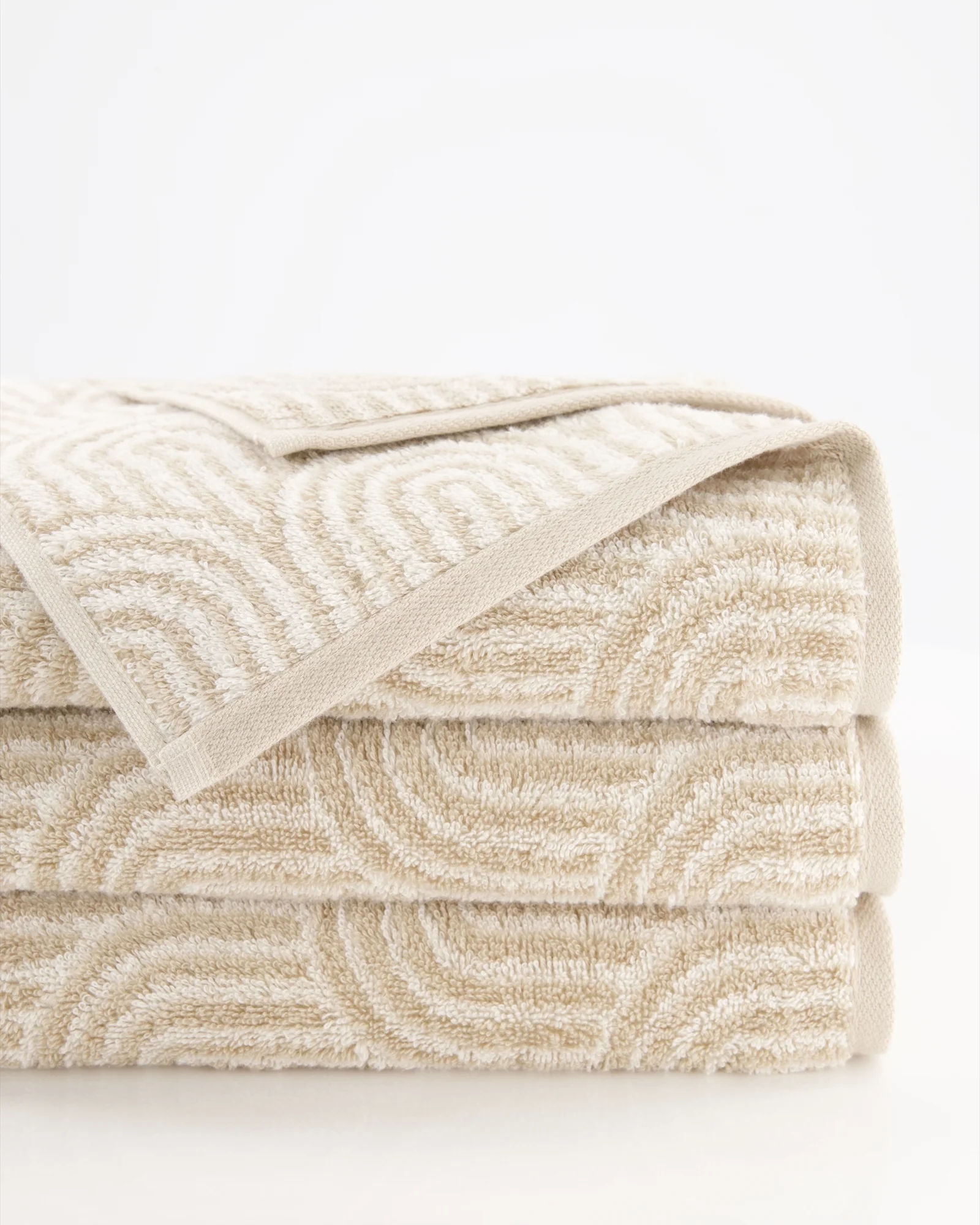 Cawö Håndklæde Serie i 100% bomuld i dessin Maison Bögen Natur.  håndklæde serien har en god sugeevne og et grafisk mønster