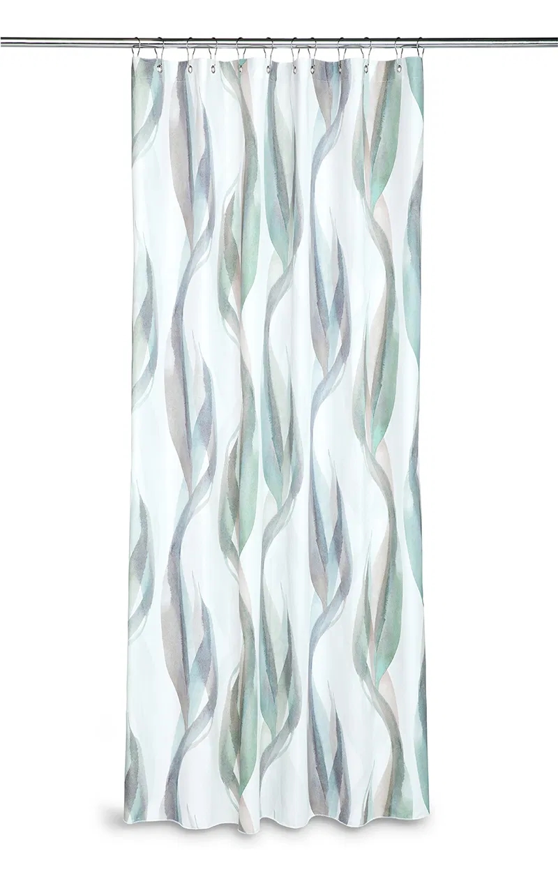 Eksklusivt antibakterielt badeforhæng i fine grønne nuancer. Trykt med bløde penselstrøg, der leder tankerne hen på siv, som slynger sig ind i hinanden.