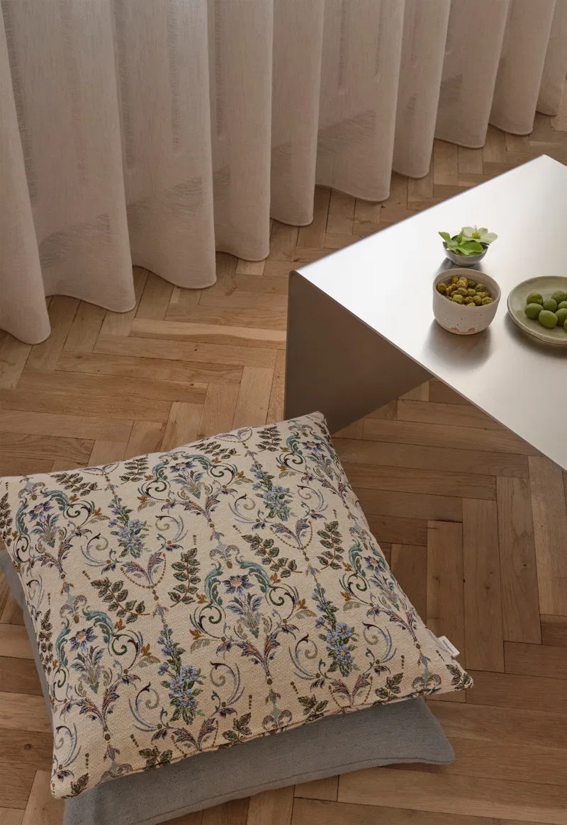 Elora pyntepude i blå er designet med et elegant mønster af fine blomster og raffinerede detaljer, der giver puden et nostalgisk og levende udtryk. De smukke blå nuancer skaber ro og dybde i indretningen, mens det tidløse design gør puden nem at kombinere med både klassisk og moderne boligstil.