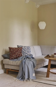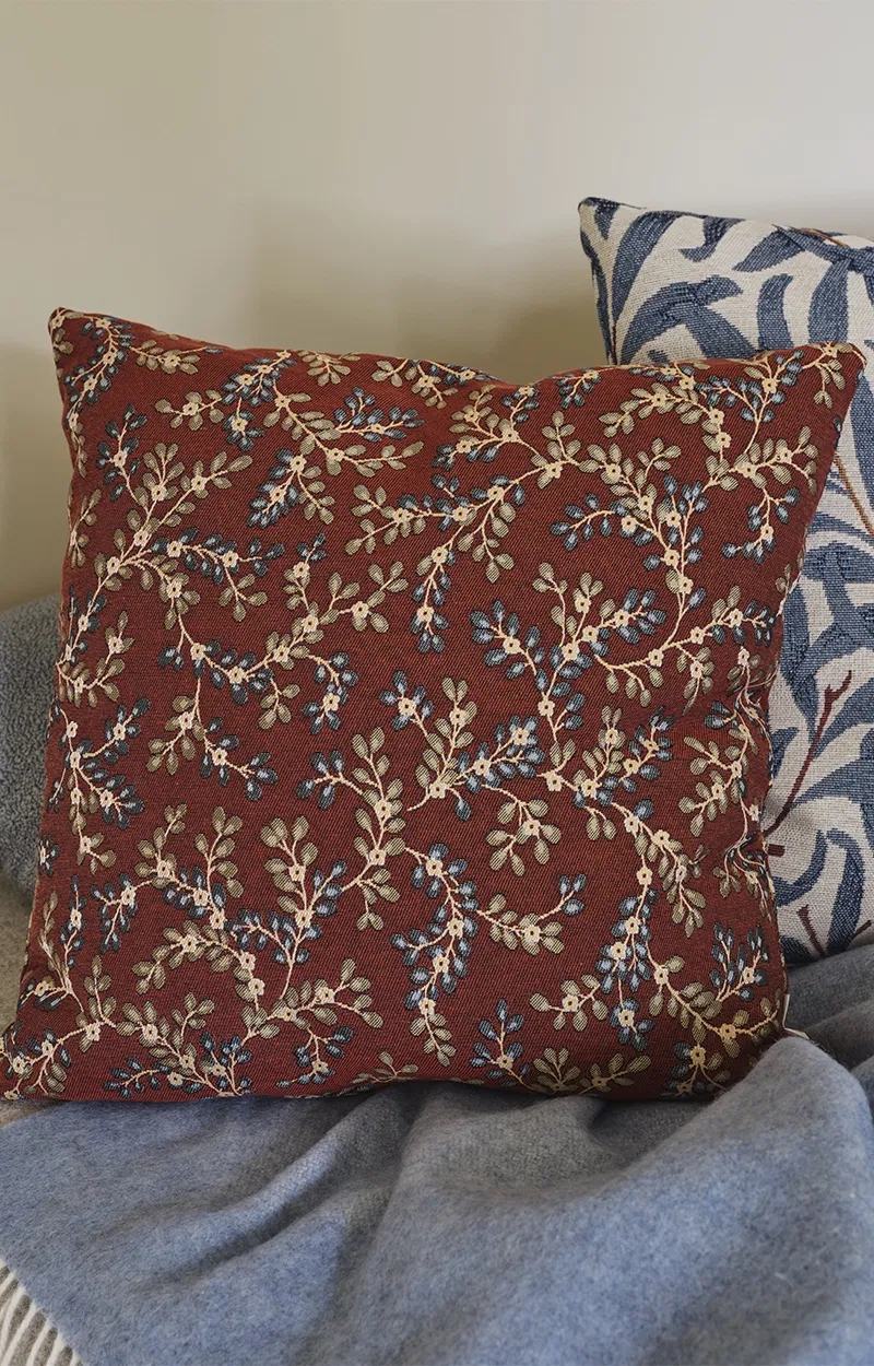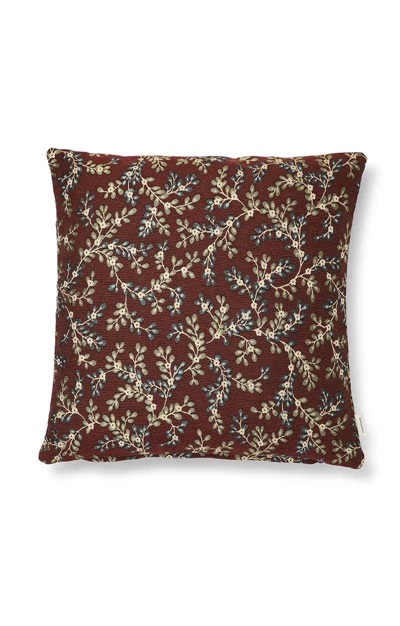 Fine bær ranker i nuancer af blå og grå skaber en enkel og elegant kontrast til Selki-pudens klare, rustbrune bund. Jacquardvævningen giver puden et smukt og taktilt udtryk.