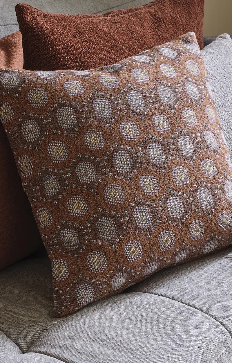 En smuk brændt rustfarve balanceres af et diskret, vintageinspireret design i den karakterfulde Cuneo-pude, som falder naturligt ind og tilfører dybde til et enkelt interiør.