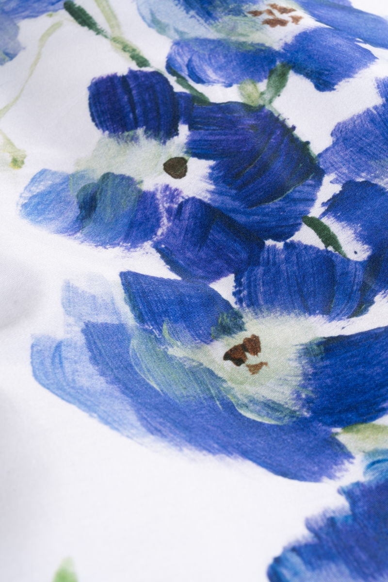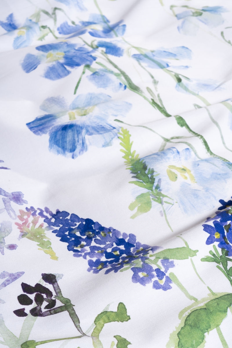 De detaljerede blomster i blå, lilla og grønne nuancer står flot mod den lyse bund og tilfører både liv og dybde – uden at virke for voldsomt. Udtrykket er let, luftigt og inspireret af vilde blomsterenge, hvilket giver en afslappende og harmonisk atmosfære.