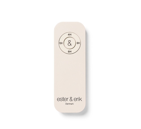 Ester & erik fjernbetjeningen er designet til at fungere med alle ester & erik LED-lys. Vælg mellem fire forskellige timer funktioner og lad dine ester & erik LED-lys være tændt i 4, 6, 8 eller 10 timer. Det karakteristiske ester & erik logo placeret i midten fungerer som en let tilgængelig TÆND/SLUK knap, der gør det nemt for dig at styre alle dine ester & erik LED-lys på én gang.