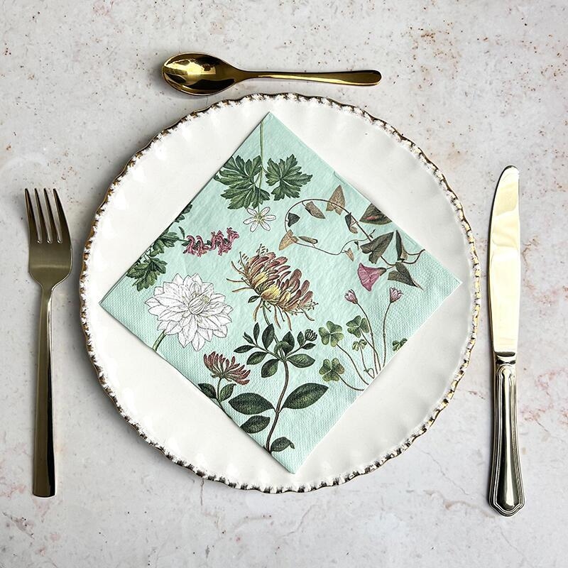 Skønne servietter med smukke motiver af vilde planter fra det botaniske atlas Flora Danica.