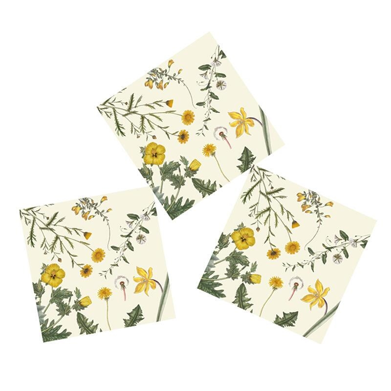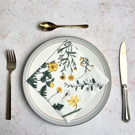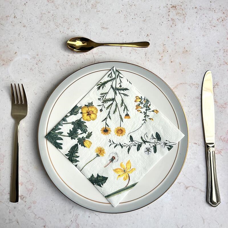 orkæl borddækningen med disse elegante servietter med blomster i varme gule nuancer inspireret af det ikoniske botaniske værk Flora Danica. Servietterne er både smukke og praktiske og giver ethvert måltid et naturinspireret, botanisk touch.
