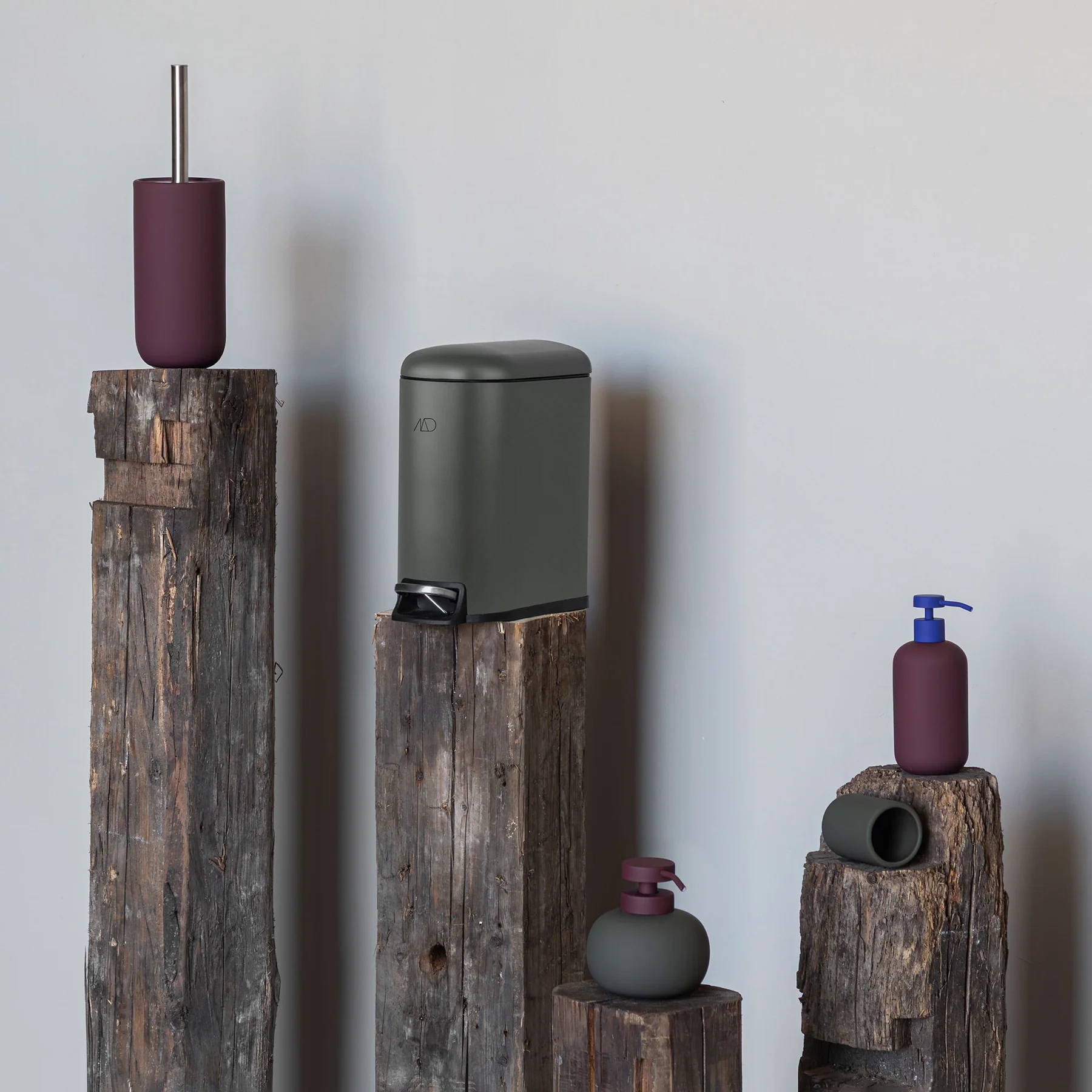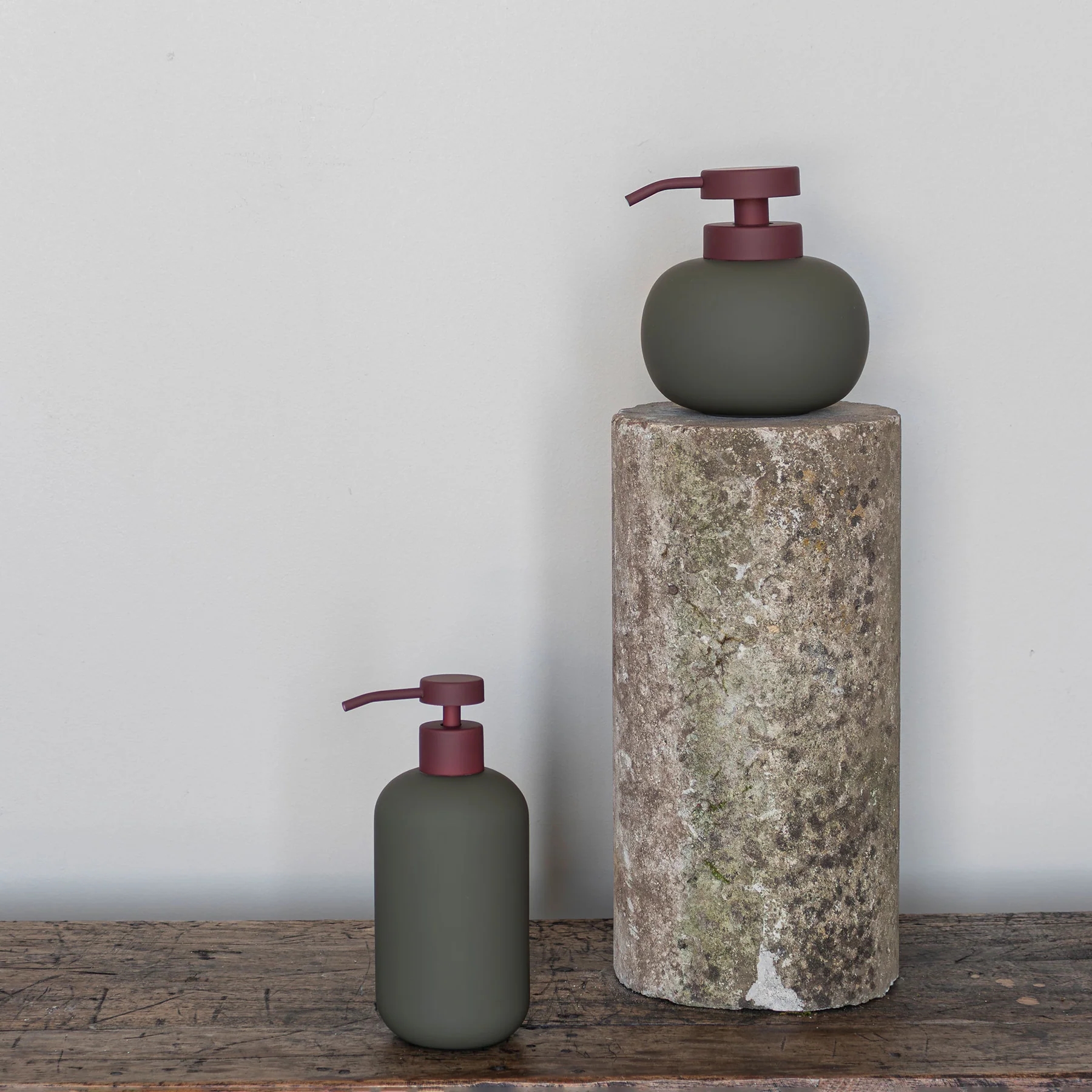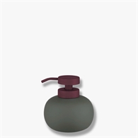 LOTUS PLAY dispenseren fra Mette Ditmer har en lav, rund form og en mørk olivengrøn farve. Overfladen er belagt med en mat gummi-finish, som giver et blødt og eksklusivt udtryk – og samtidig gør dispenseren nem at rengøre. Den vinrøde pumpe skaber en tydelig kontrast og giver dispenseren et grafisk og legende udtryk, der skiller sig ud i både badeværelse og køkken.