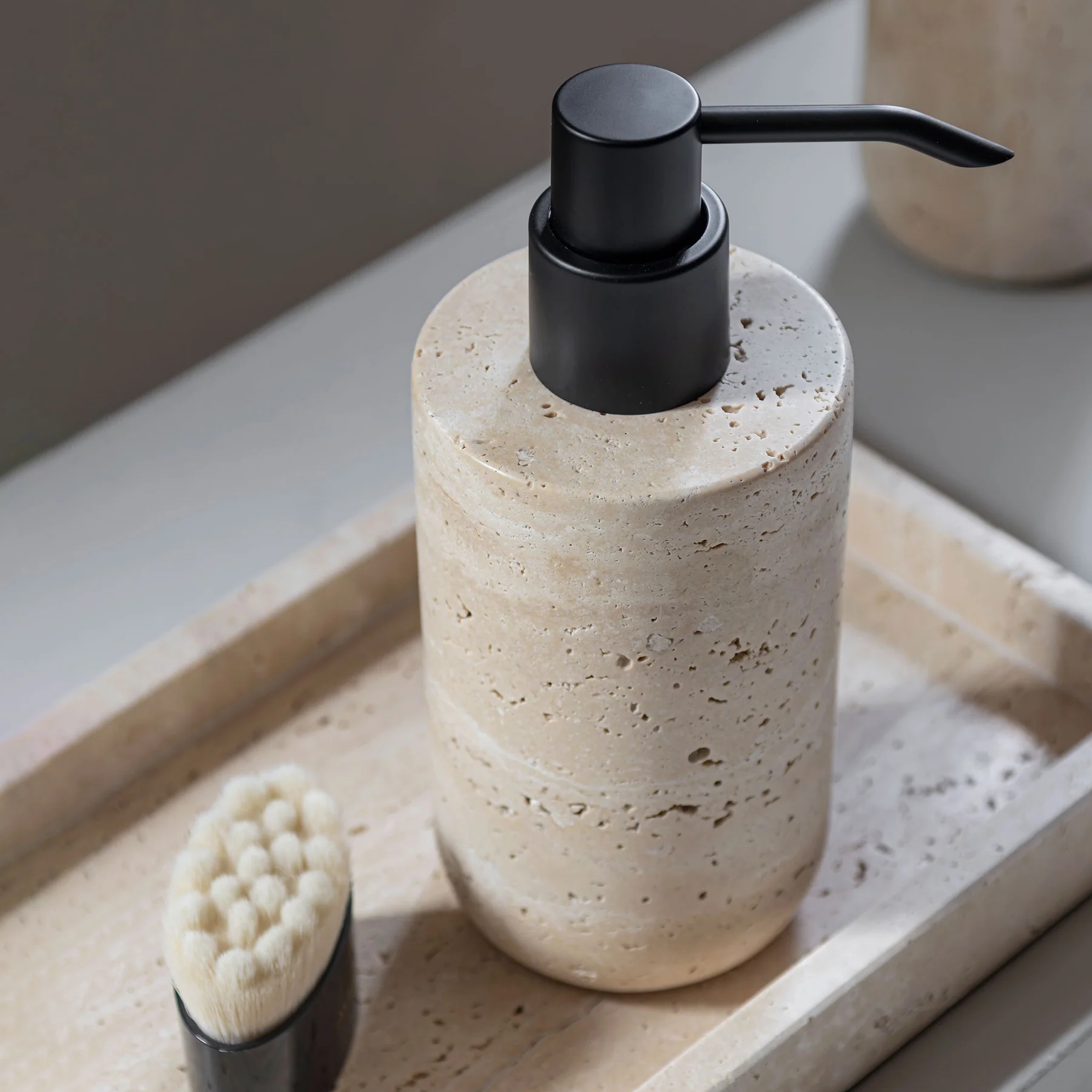 Dispenseren har en sort ABS-pumpe og kan kombineres med andre produkter i TRAVERTIN-serien for et strømlinet look.