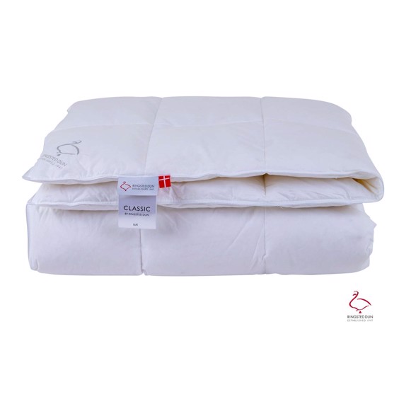 Ringsted Dun Classic Lux dynen har en bæreevne på 725 og det lækre fyld af moskusdun er omgivet af et blødt vår i 100% bomuldscambric.