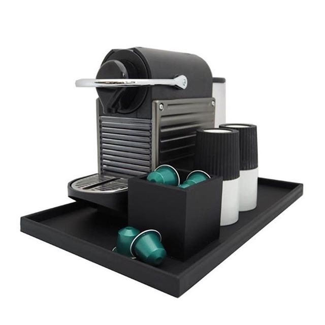 Rektangulær bakke i sort gummi fra Sej Design. På grund af stor efterspørgelse, har Sej Design nu lavet en Rektangulær bakke der passer i målene til diverse Nespresso maskiner. Bakken beskytter bordet mod vandskjolder og kaffespild samtidig med at det ser pænt ud at samle maskinen, kapsler, kop mm. på bakken.